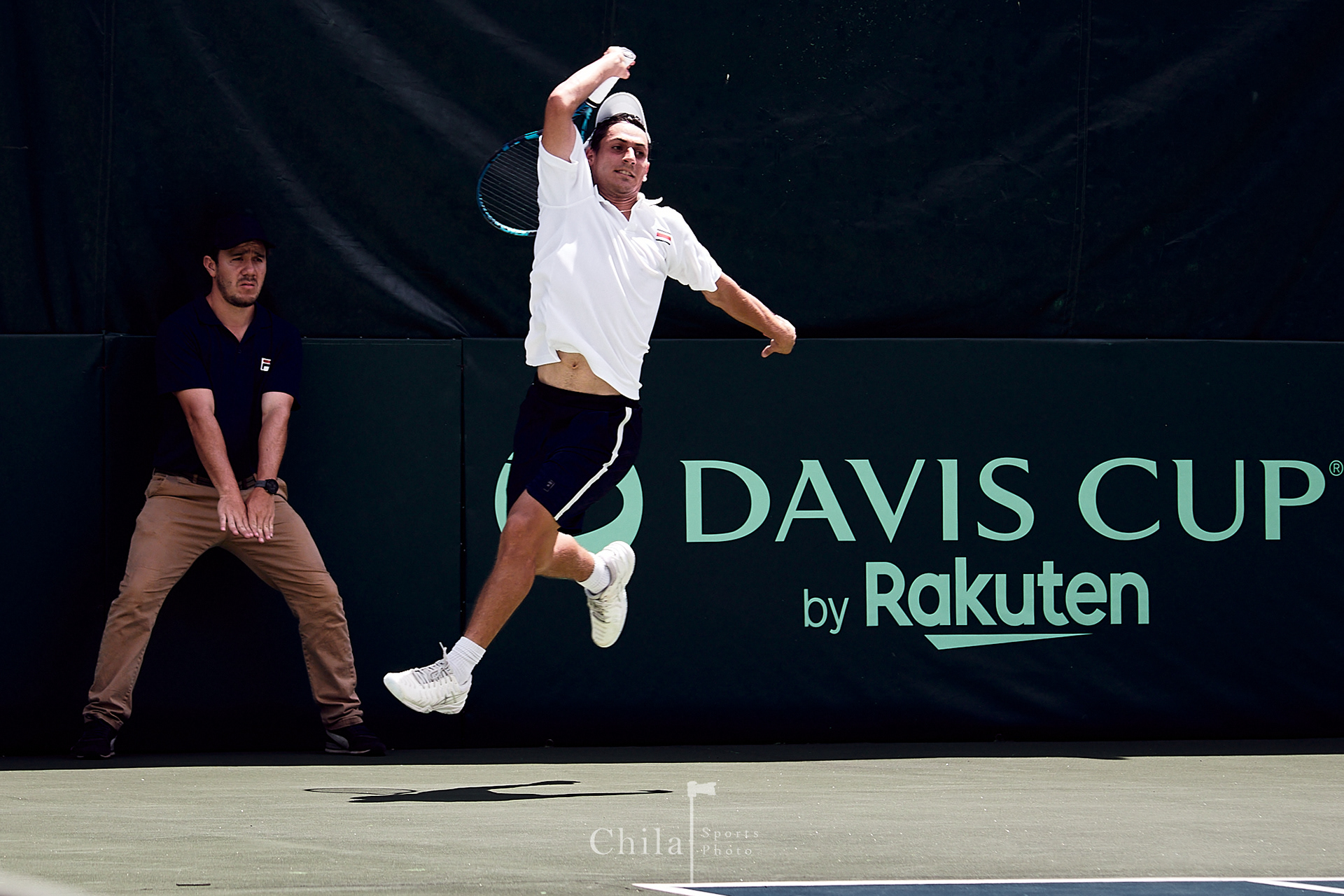 Sebastián Quirós (CRC) mantiene su apoyo intento en el partido de dobles de su pais.