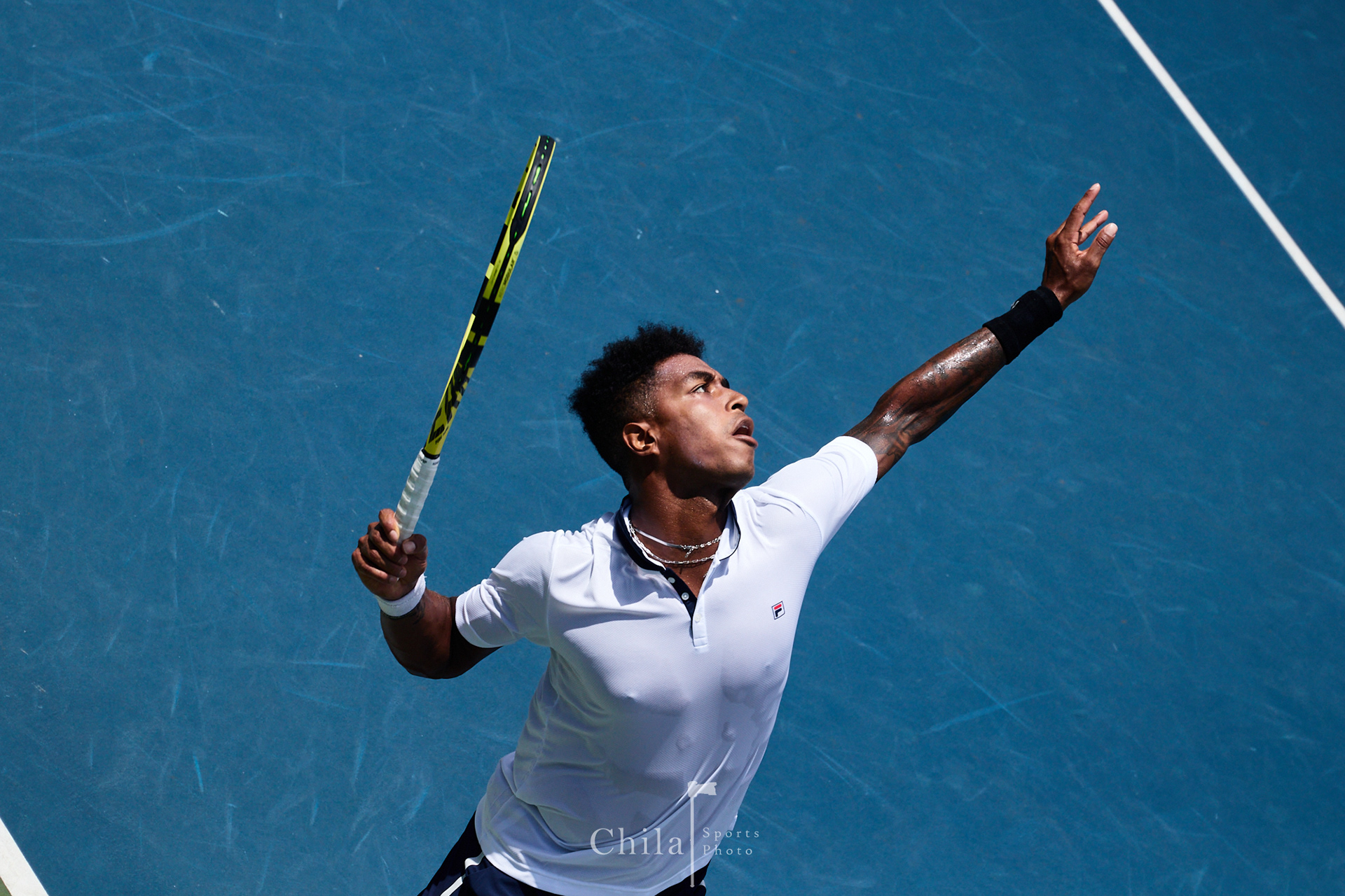 Sebastián Quirós (CRC) realiza su servicio en la cancha principal en la Copa Davis 2022